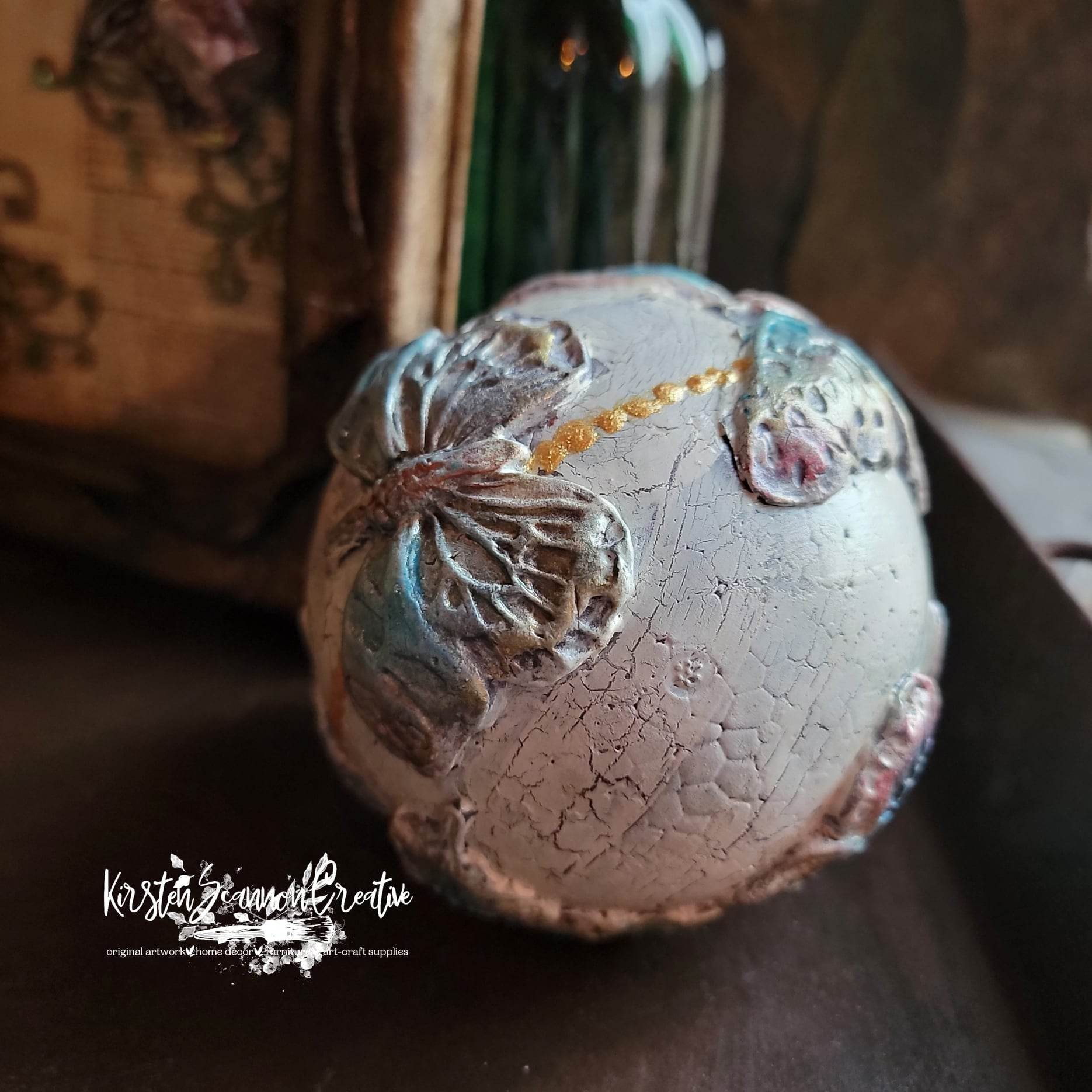 This handcrafted Decor Sphere is a whimsical sight to behold! I created it using a 4" styrofoam ball and gorgeous clay cast butterfly molds, then carefully added a crackle effect and hand-painted it with a copper base and a splash of vibrant color. Each butterfly was lovingly given its own eye-catching look, and the whole masterpiece was finished off with some glimmering gold bead rope and a glossy varnish. Perfect for sprucing up any interior decoration - it's lightweight, full of life, and adds texture and visual interest to your space. Place it in a tray, vase, or bowl, and let it take flight in your home - just keep it indoors! (Other items in photos sold separately).