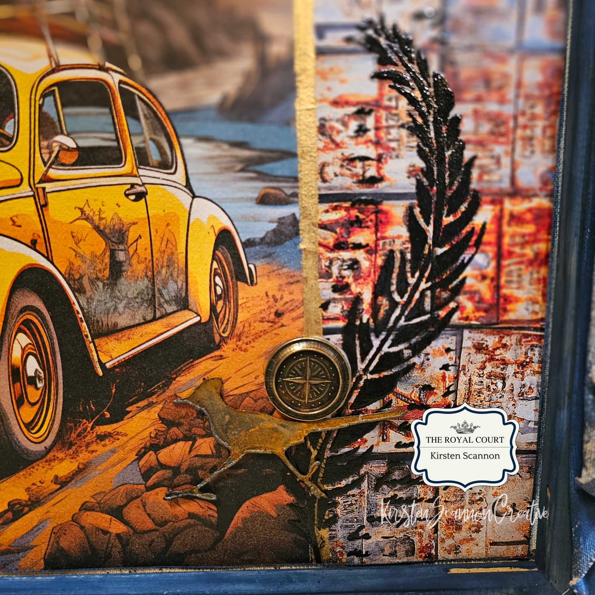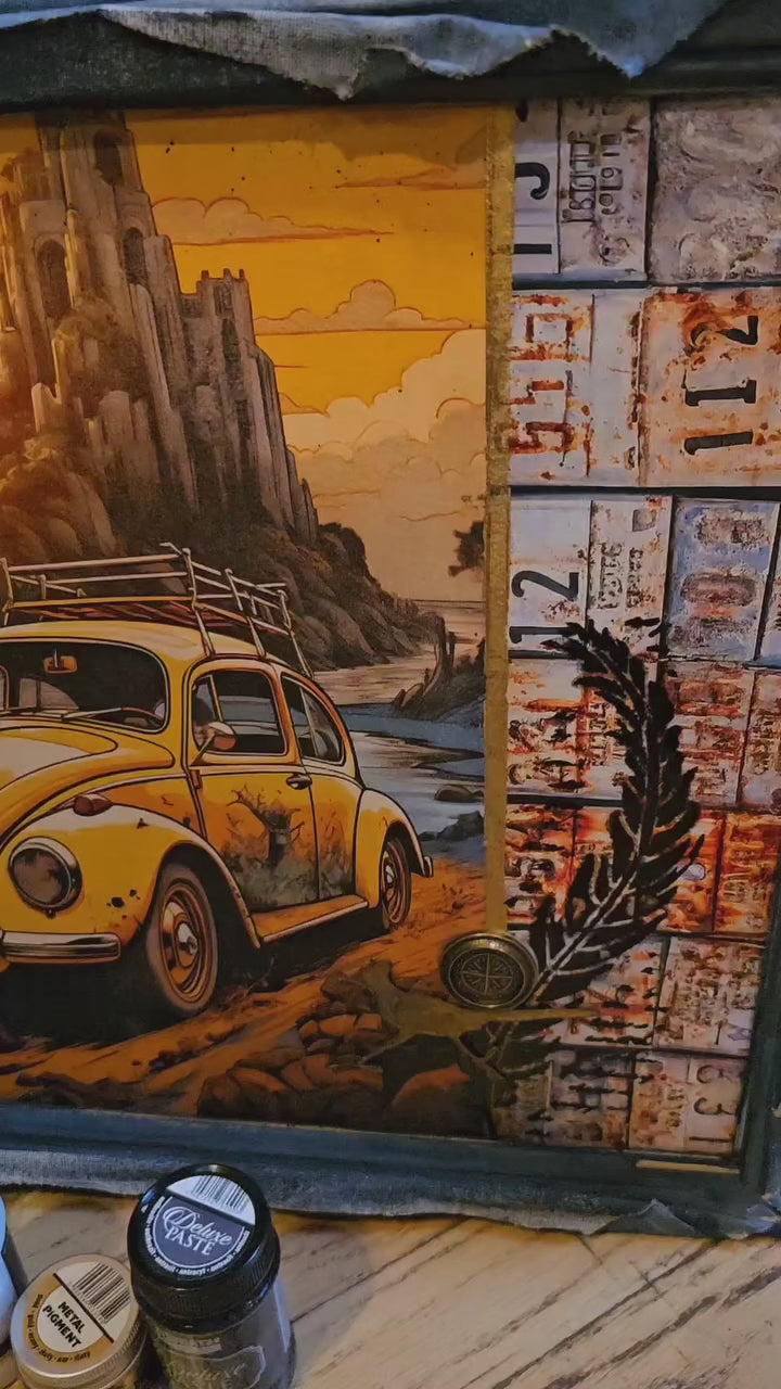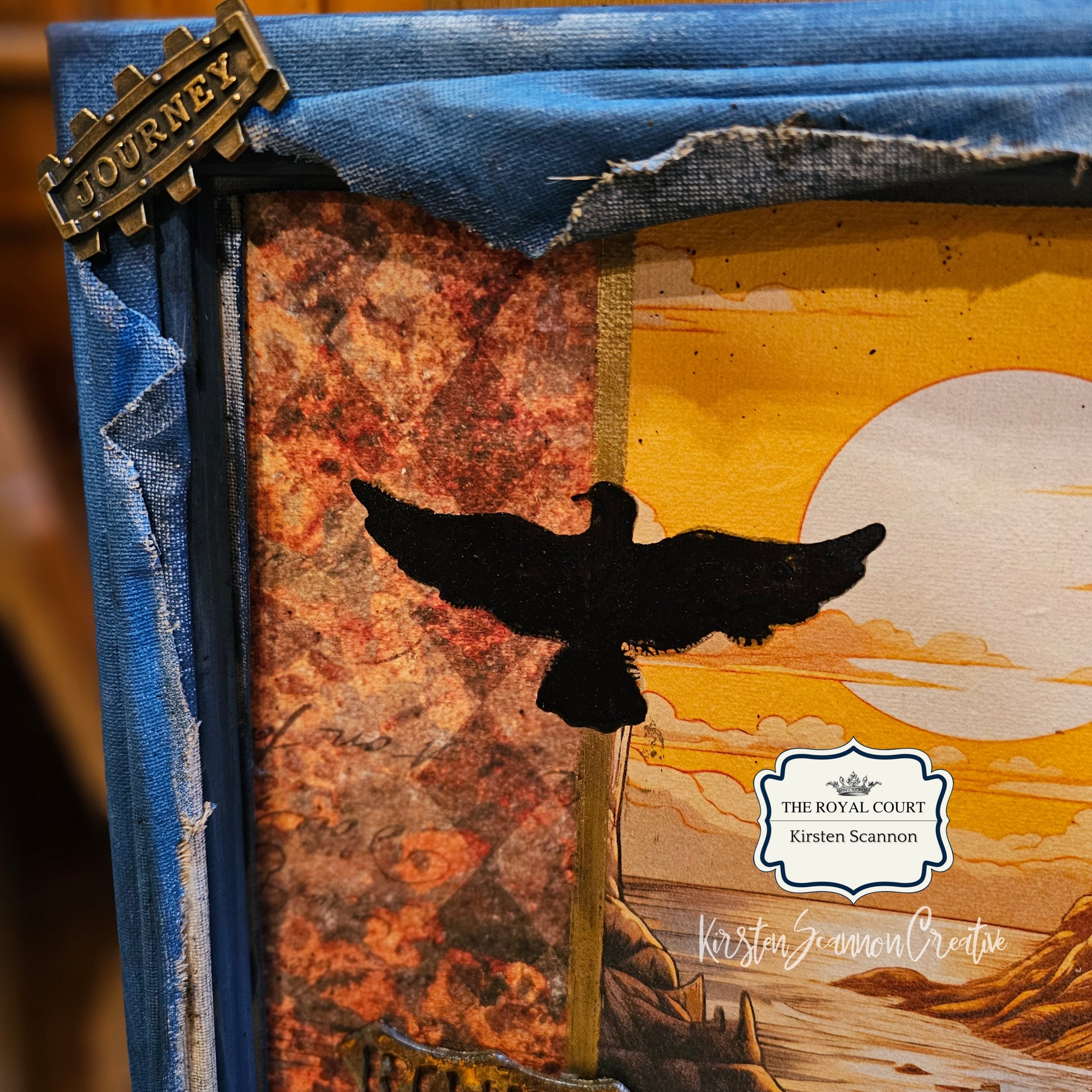 I used decoupage rice papers from Paper Designs and Decoupage Queen, Pentart mediums, Mitform_castings metal castings as well as some I curated off Etsy, all on a reverse canvas.