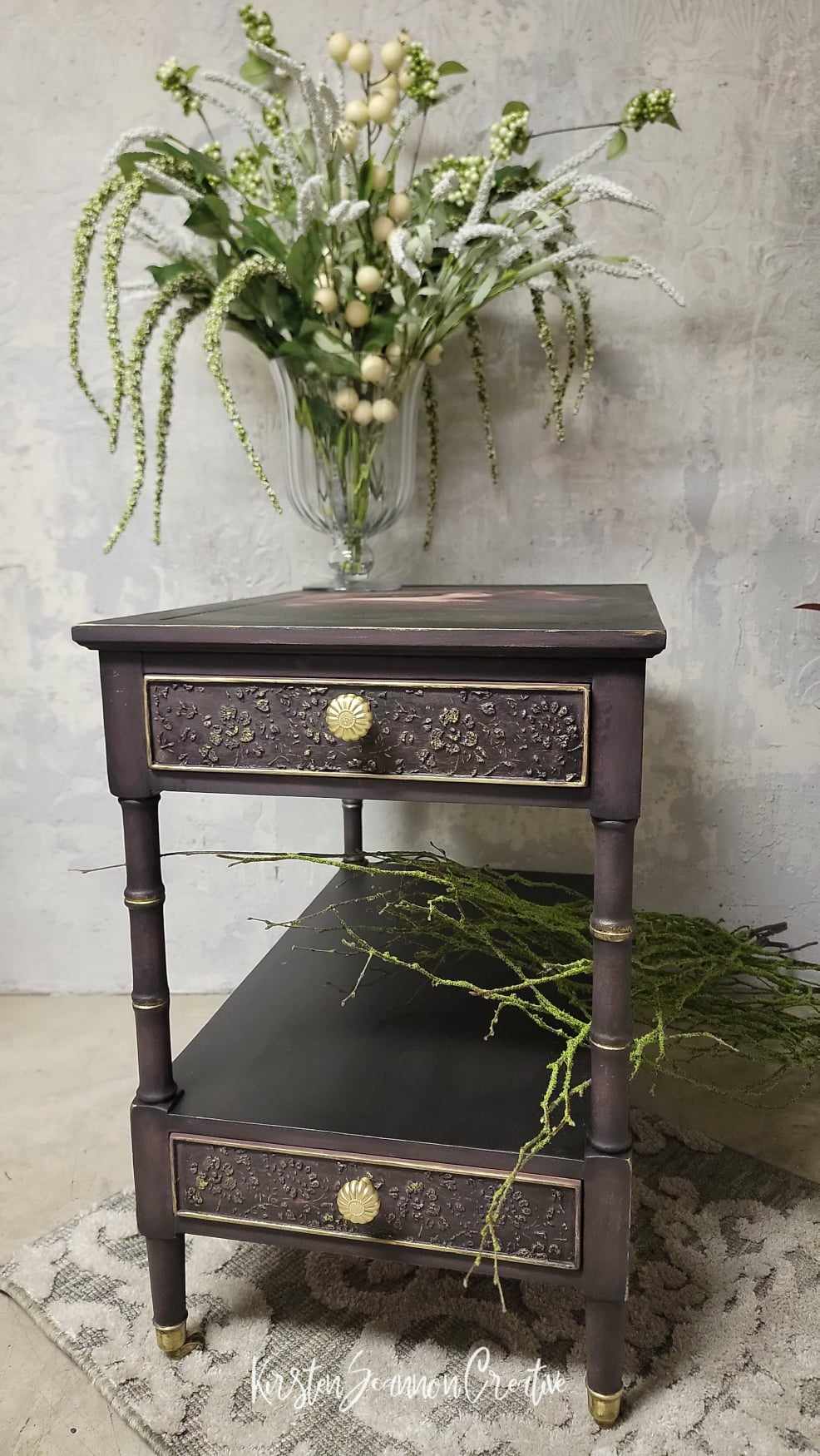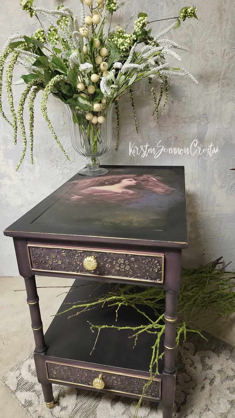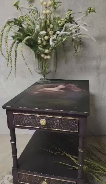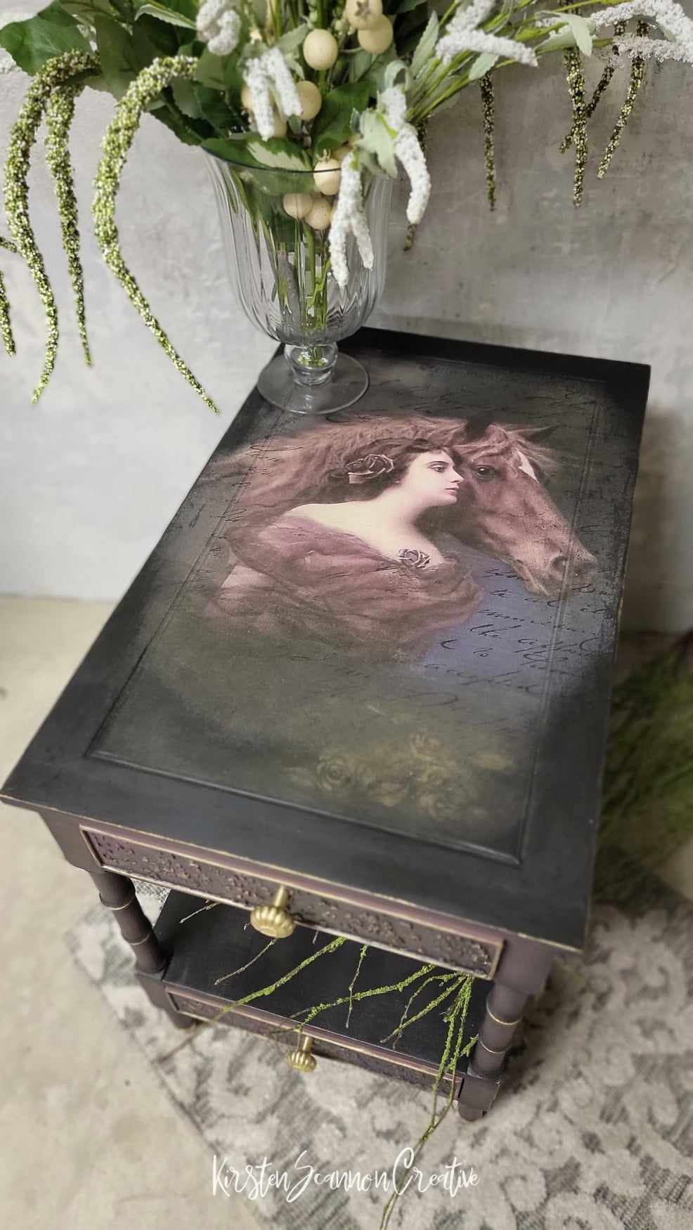 This Equestrian Theme Vintage Hekman Side Table on Casters has been elegantly restored using clay-chalk paint from Daydream Apothecary in Poison Ivy, a luxurious reddish plum, and Raven Black Glaze from Paint Couture. The tabletop boastis an A2 size decoupage design, Equestrian Beauty from Decoupage Queen and is stenciled in an opulent gold rose motif which was wiped back to give a timeworn finish to blend in with the beautiful design. Edge detailing and raised stenciling textured with bead gel on the drawer fronts were further enhanced with luxe gold gilding. This masterpiece was sealed with hemp oil for protection.