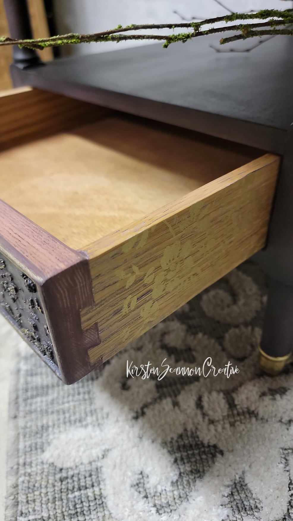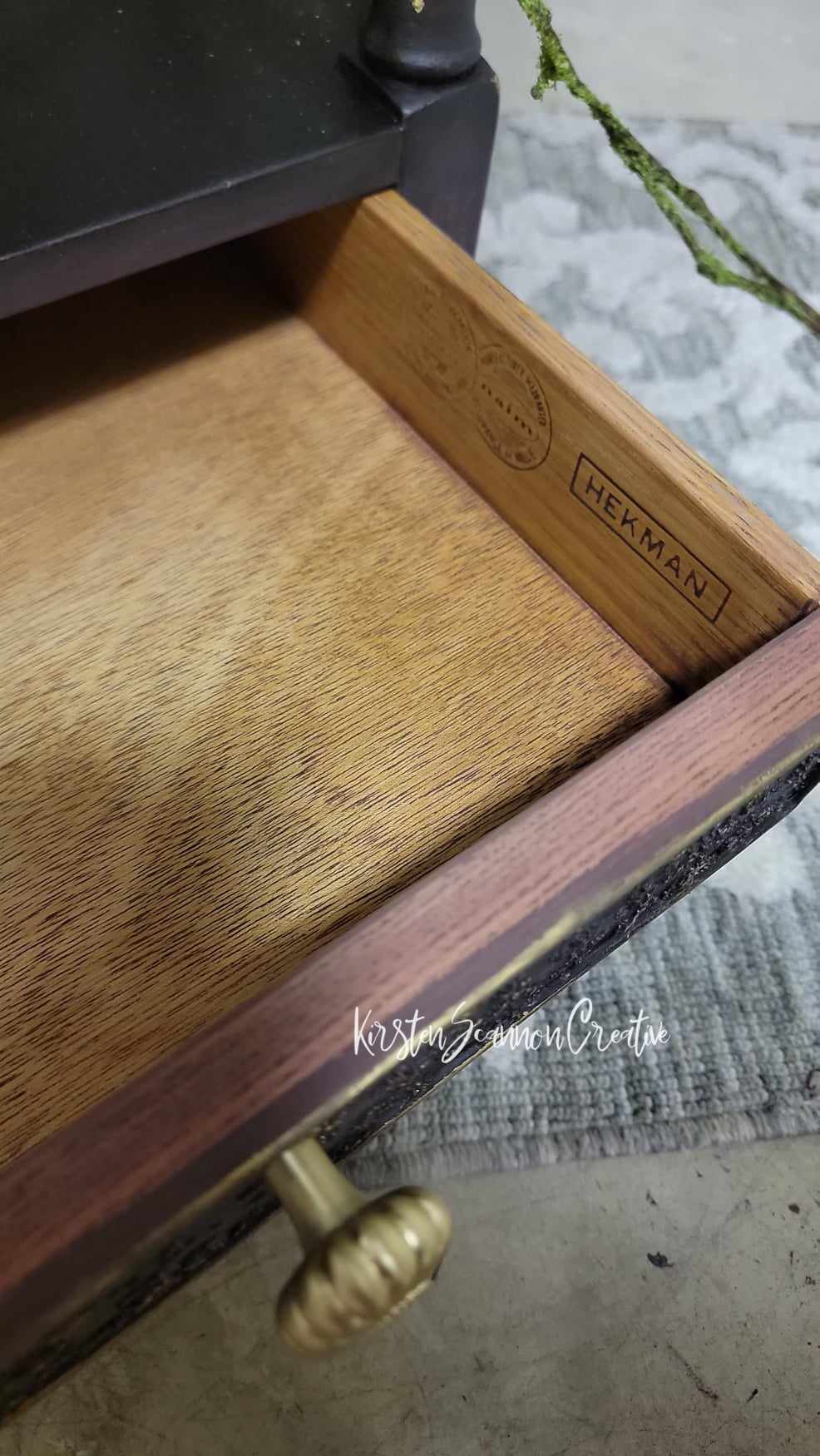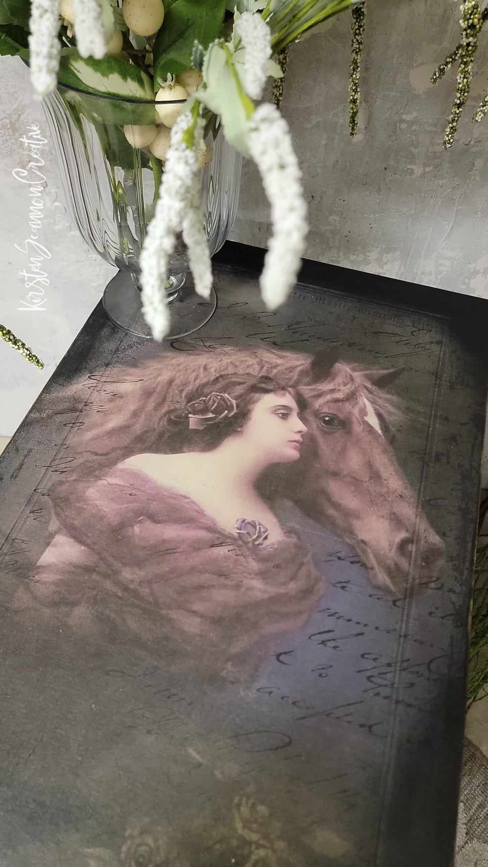 This Equestrian Theme Vintage Hekman Side Table on Casters has been elegantly restored using clay-chalk paint from Daydream Apothecary in Poison Ivy, a luxurious reddish plum, and Raven Black Glaze from Paint Couture. The tabletop boastis an A2 size decoupage design, Equestrian Beauty from Decoupage Queen and is stenciled in an opulent gold rose motif which was wiped back to give a timeworn finish to blend in with the beautiful design. Edge detailing and raised stenciling textured with bead gel on the drawer fronts were further enhanced with luxe gold gilding. This masterpiece was sealed with hemp oil for protection.