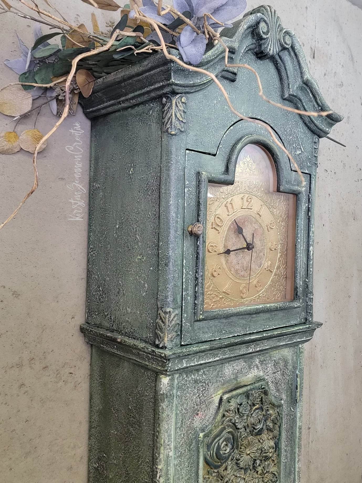 The clock itself was replaced with new clockwork. The faceplate was stenciled, painted and leafed.