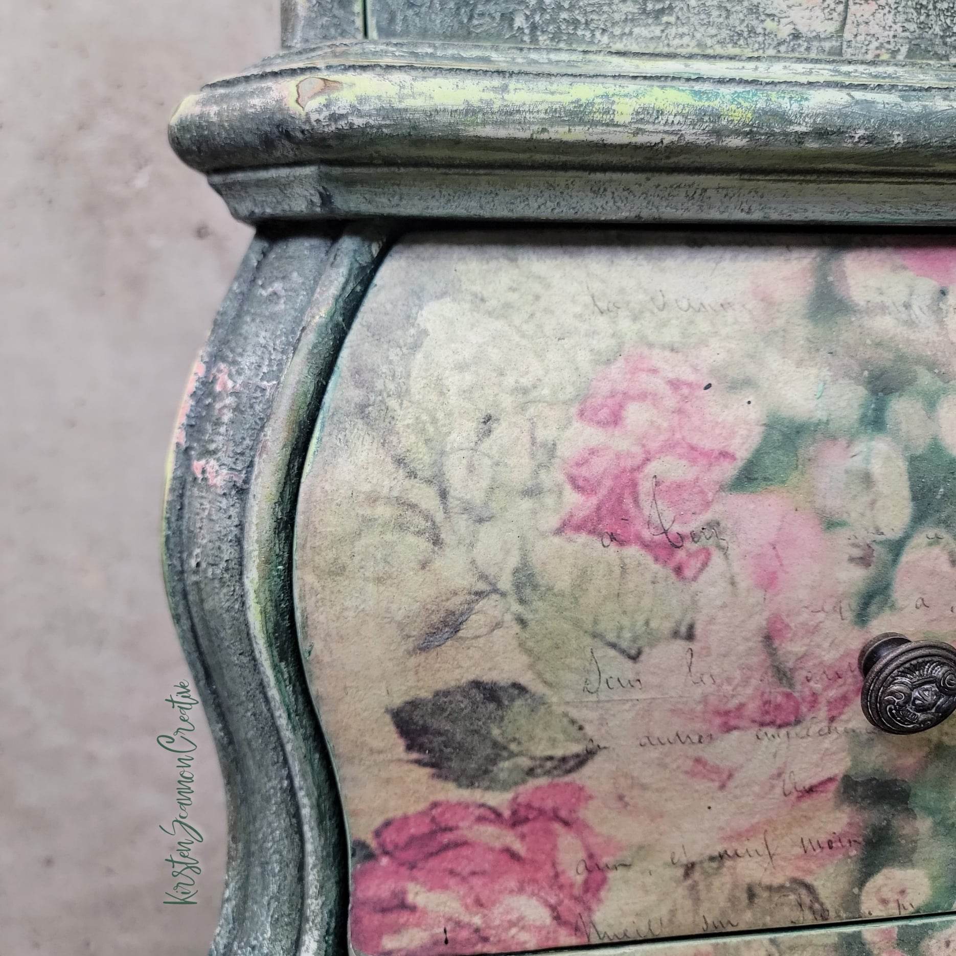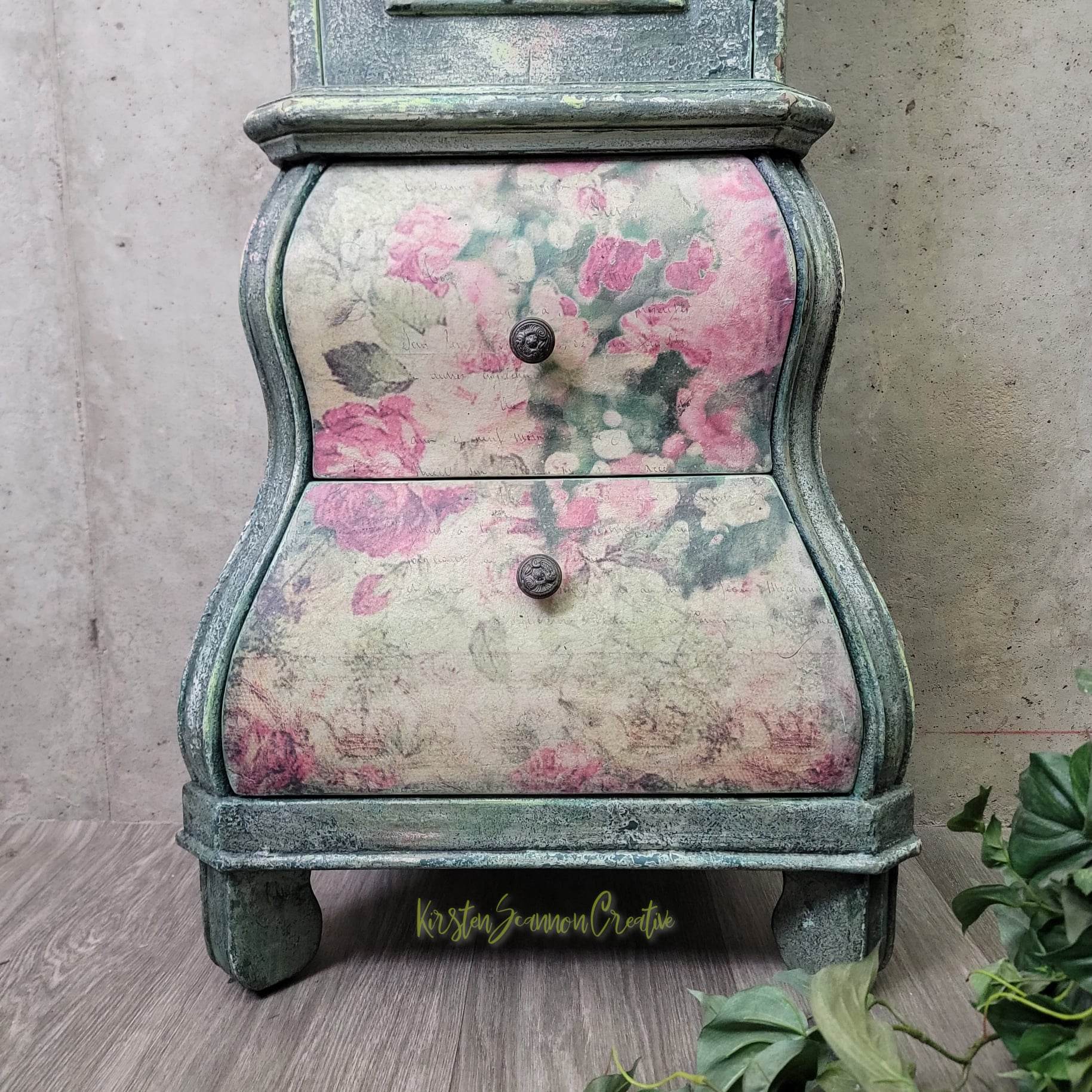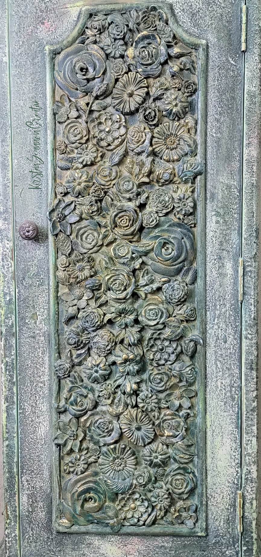 After being thoroughly cleaned, clay-chalk paints and a texture additive in layers along with glaze were used to achieve the finish. The interior of the base and top cabinets were painted as well. The inset of the door was embellished with wood-like and resin mouldings, glazed and gilded.