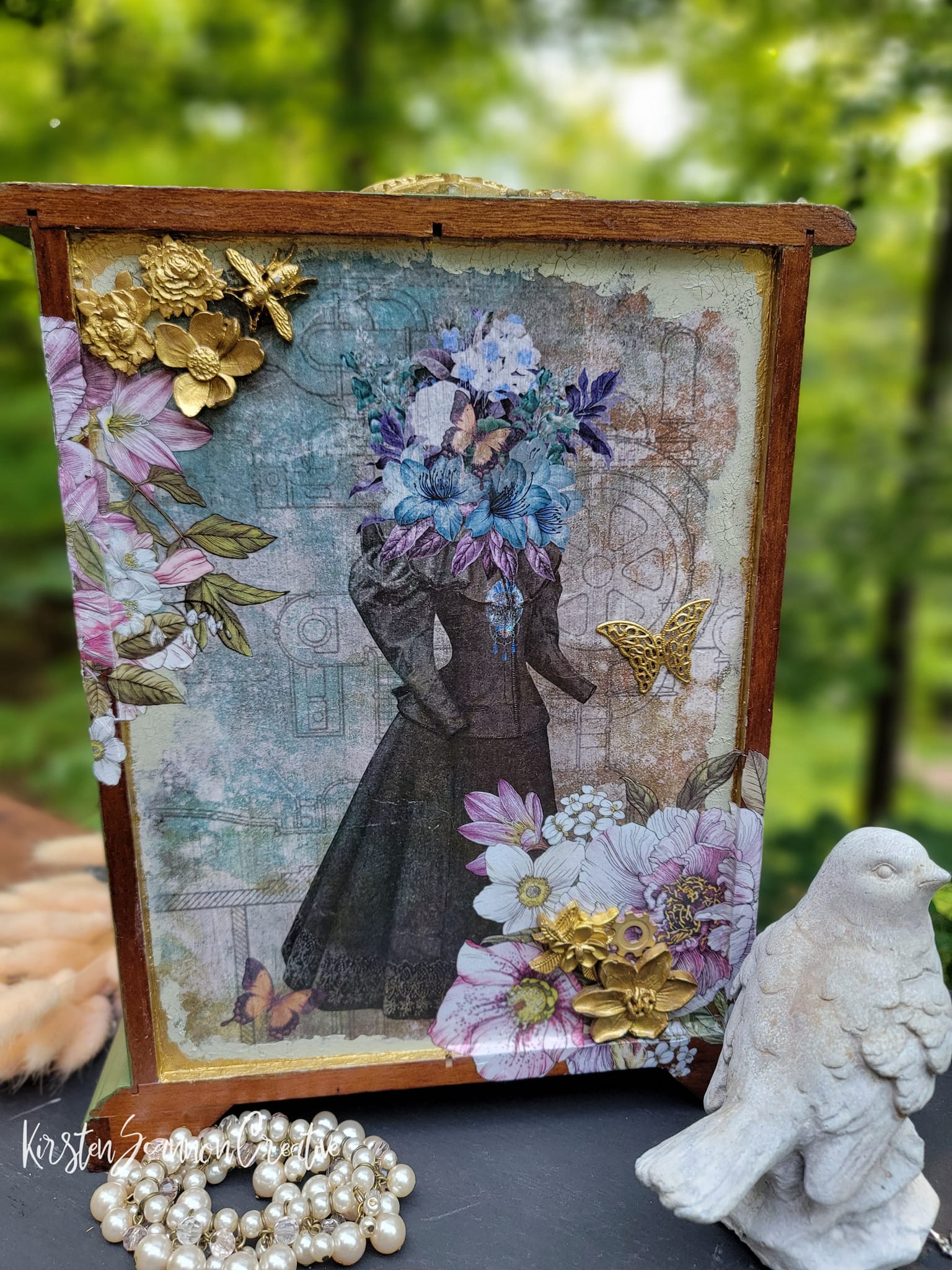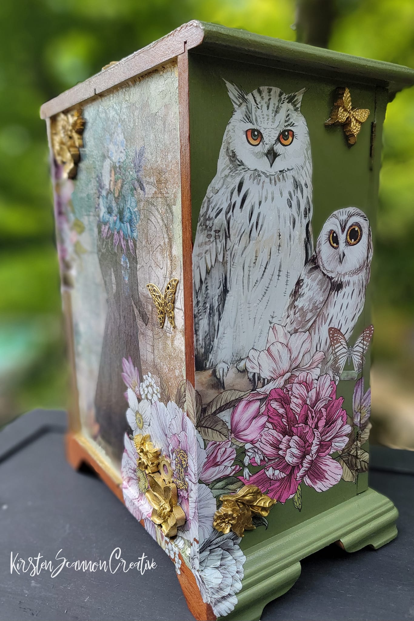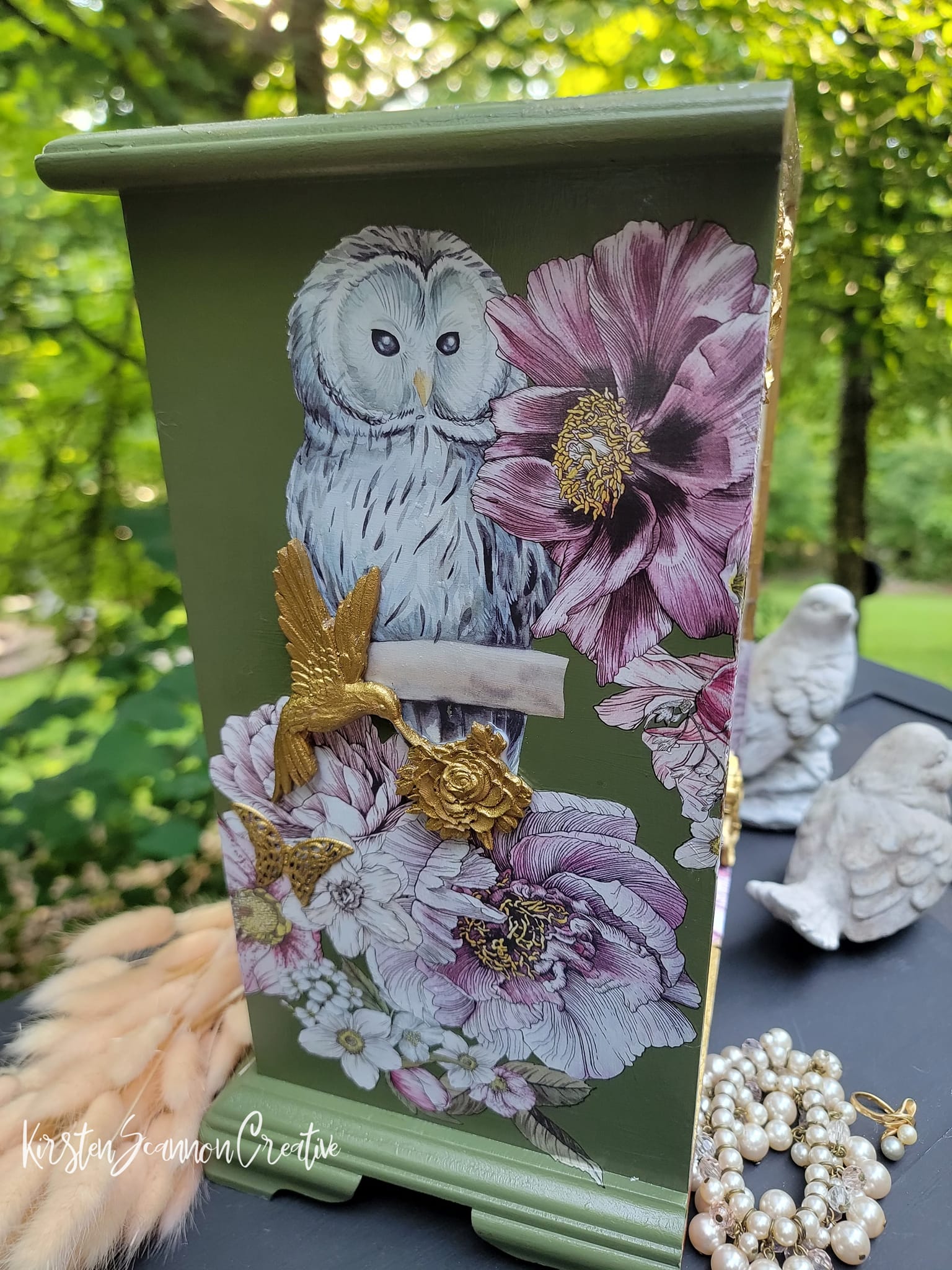 The box was painted with Dekor Chalky Paint in the stunning Thorn green color leaving some of the original wood grain to show through lending to a woodland feel. Pieces of the Dreamy Florals and Owl transfers add color and whimsy. Resin cast embellishments and metal findings give a 3D element.