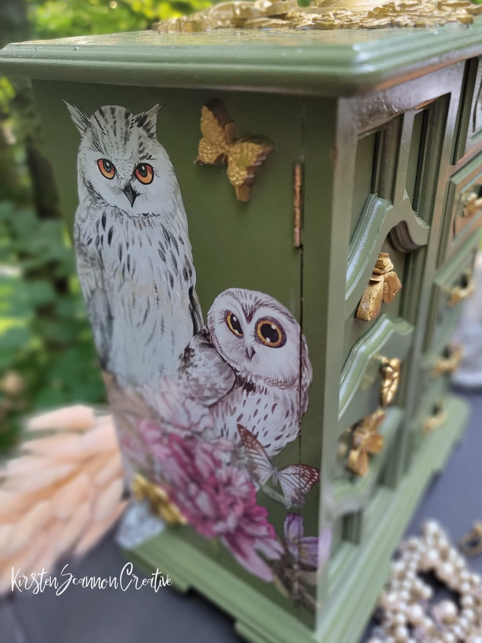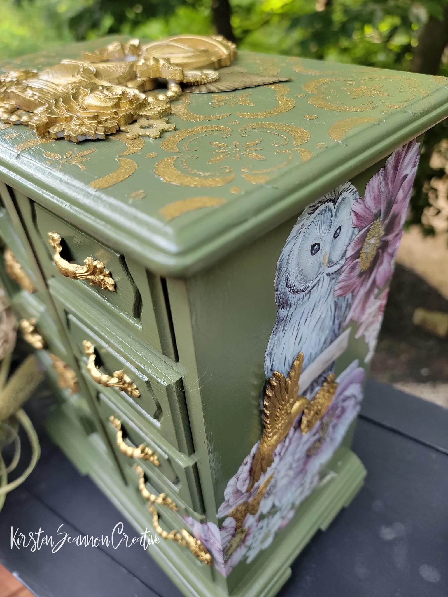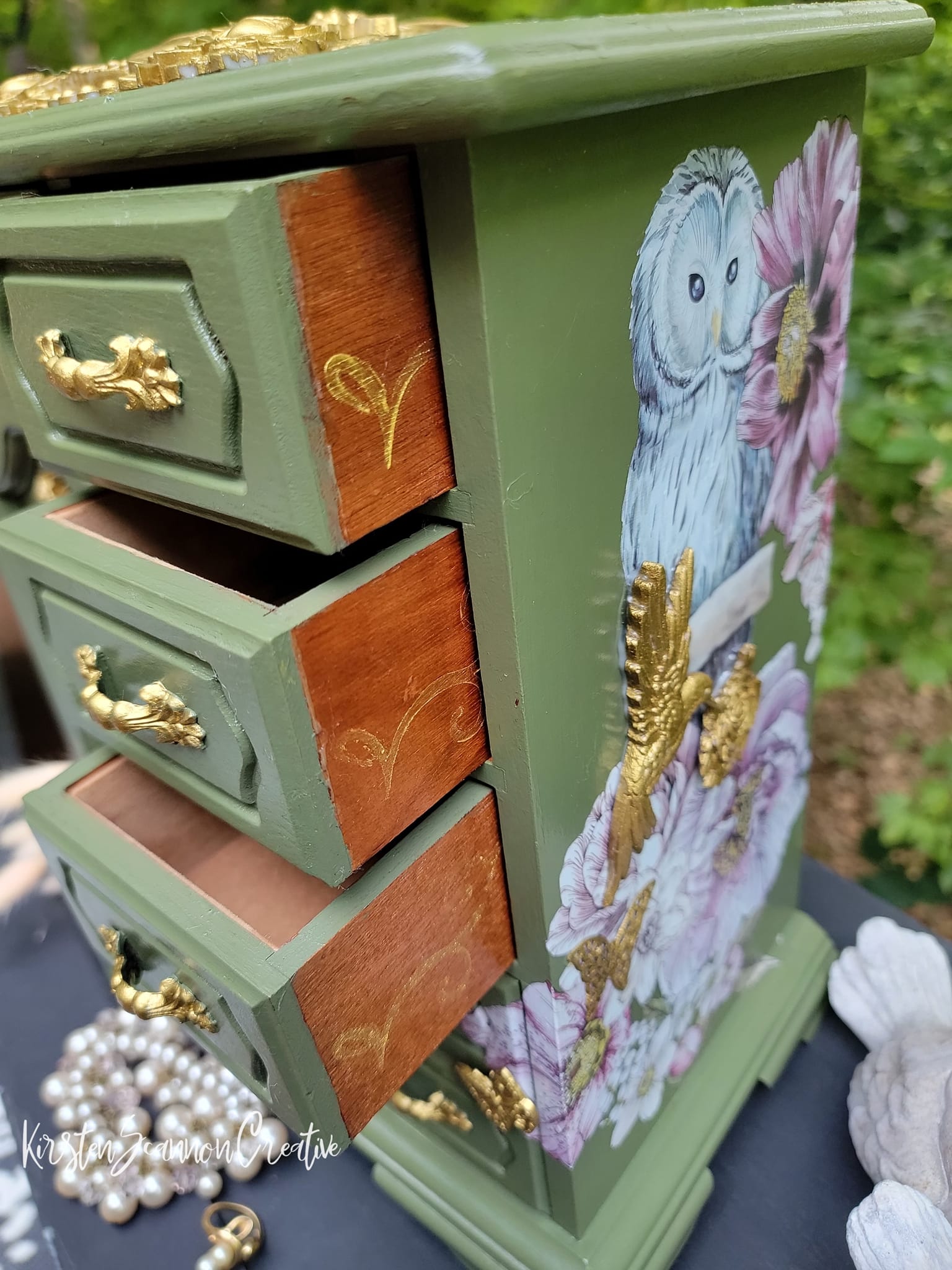 Introducing this feminine, steampunk-inspired, and whimsically hootiful jewelry box, handpainted and upcycled with style!