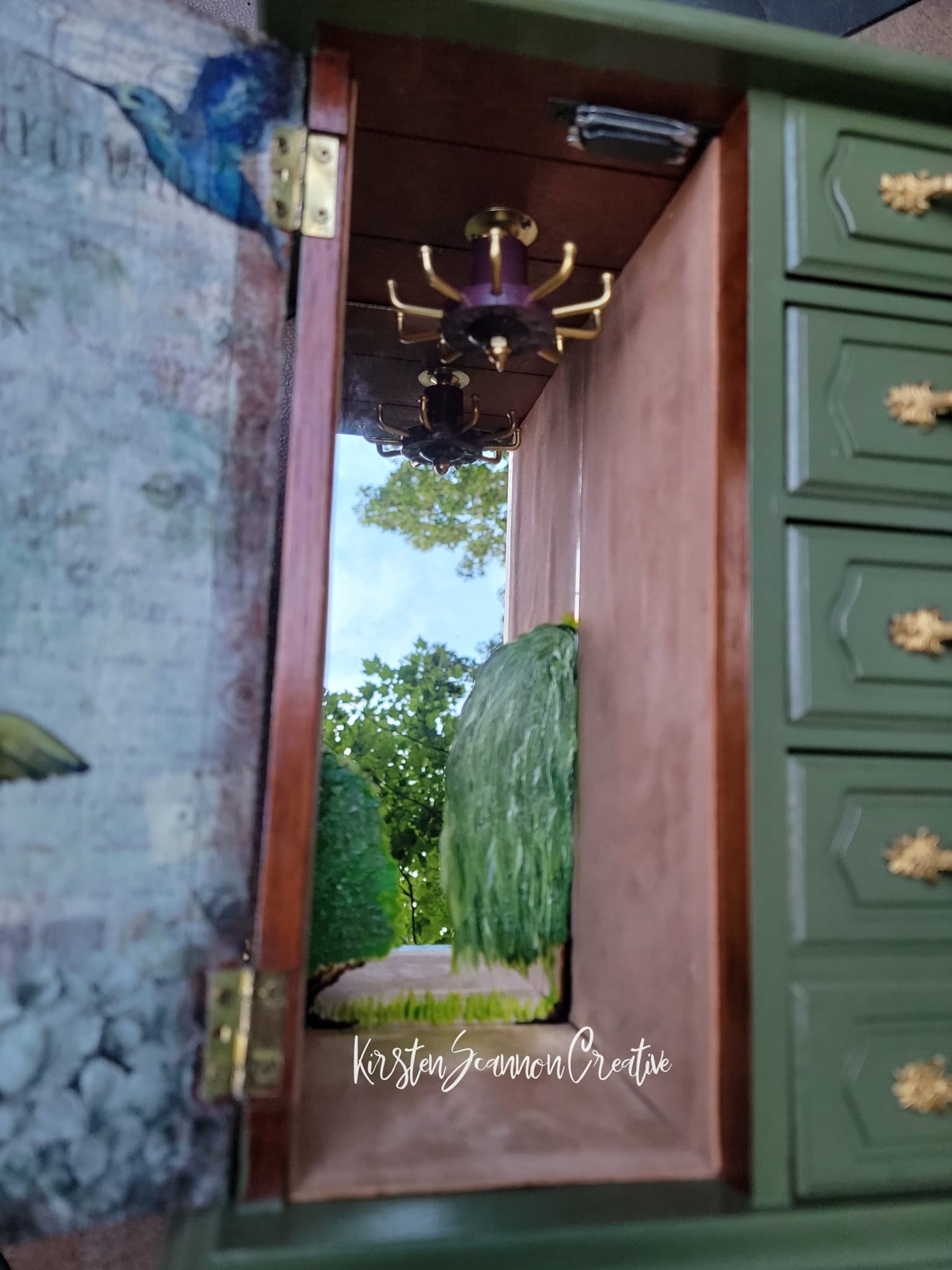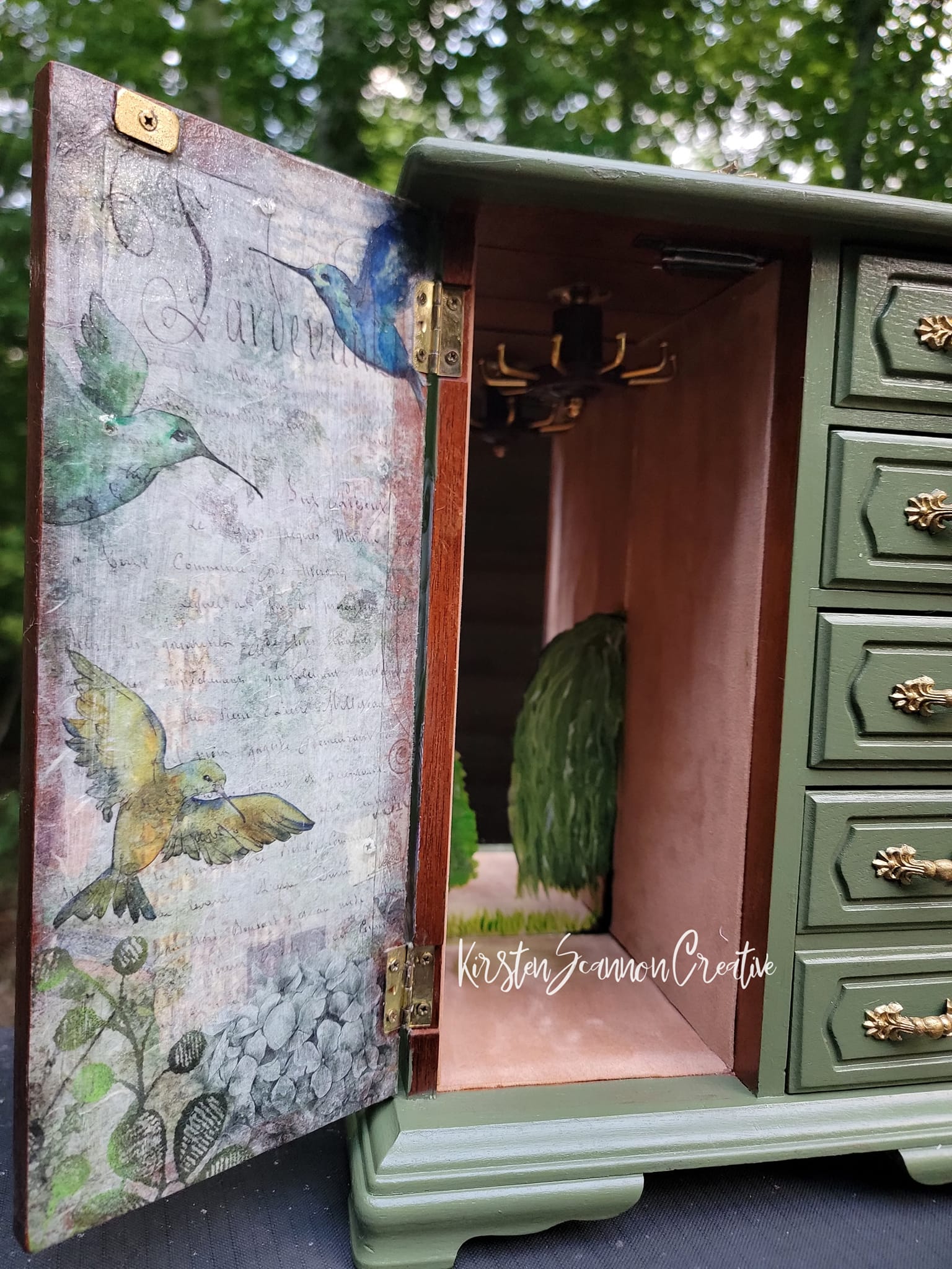 The interior is impeccable, with its blush-colored lining providing the perfect backdrop for your jewelry. The only thing that needed improvement were rough edges on the mirror onto which I covered by handpainting trees. The inside of the door was decoupaged using Afternoon Hummingbirds.