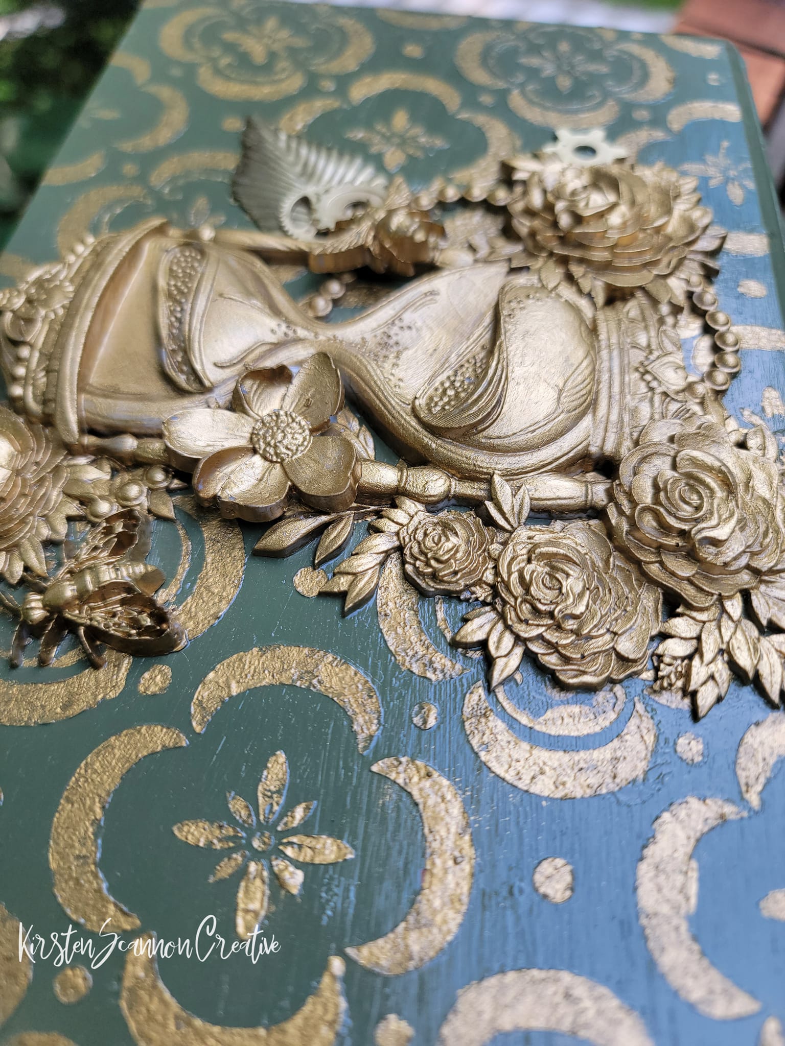 The top is adorned with a raised stencil, and colored using gold metal pigment powder and Pigment Fix which were also used to color the embellishments.