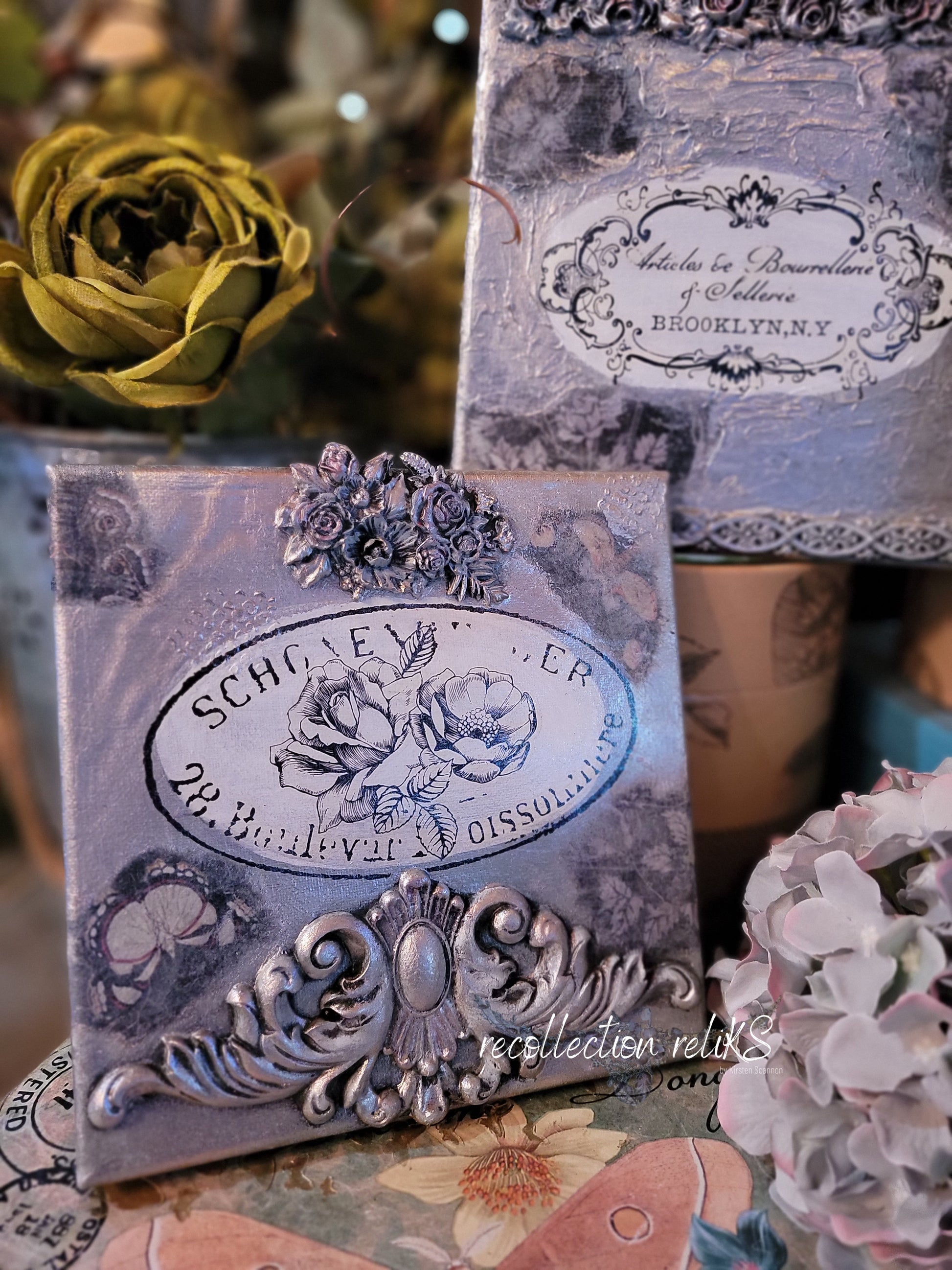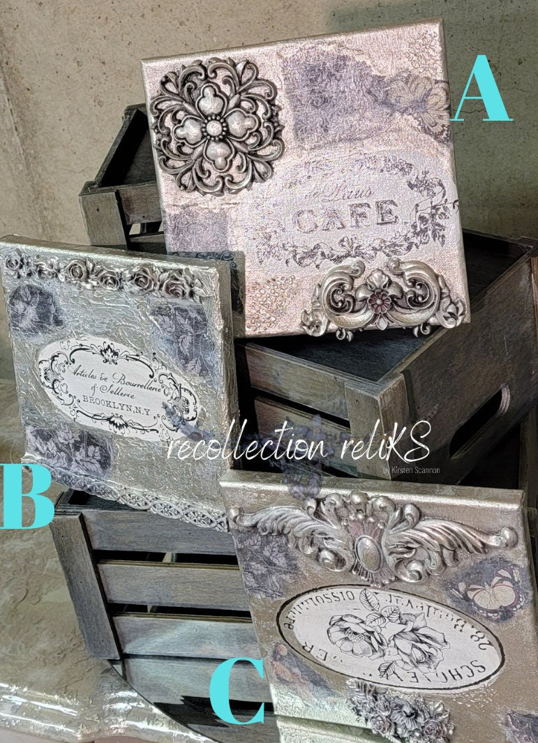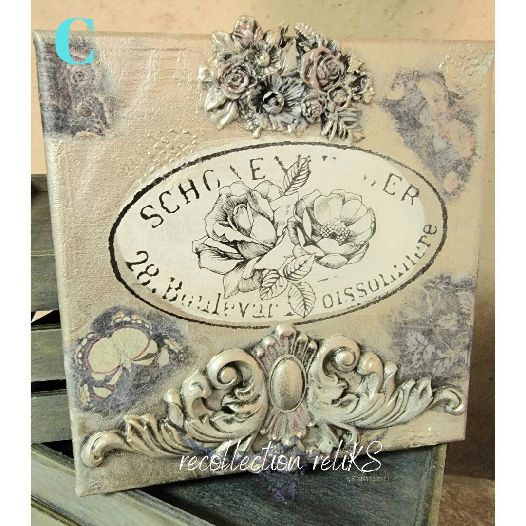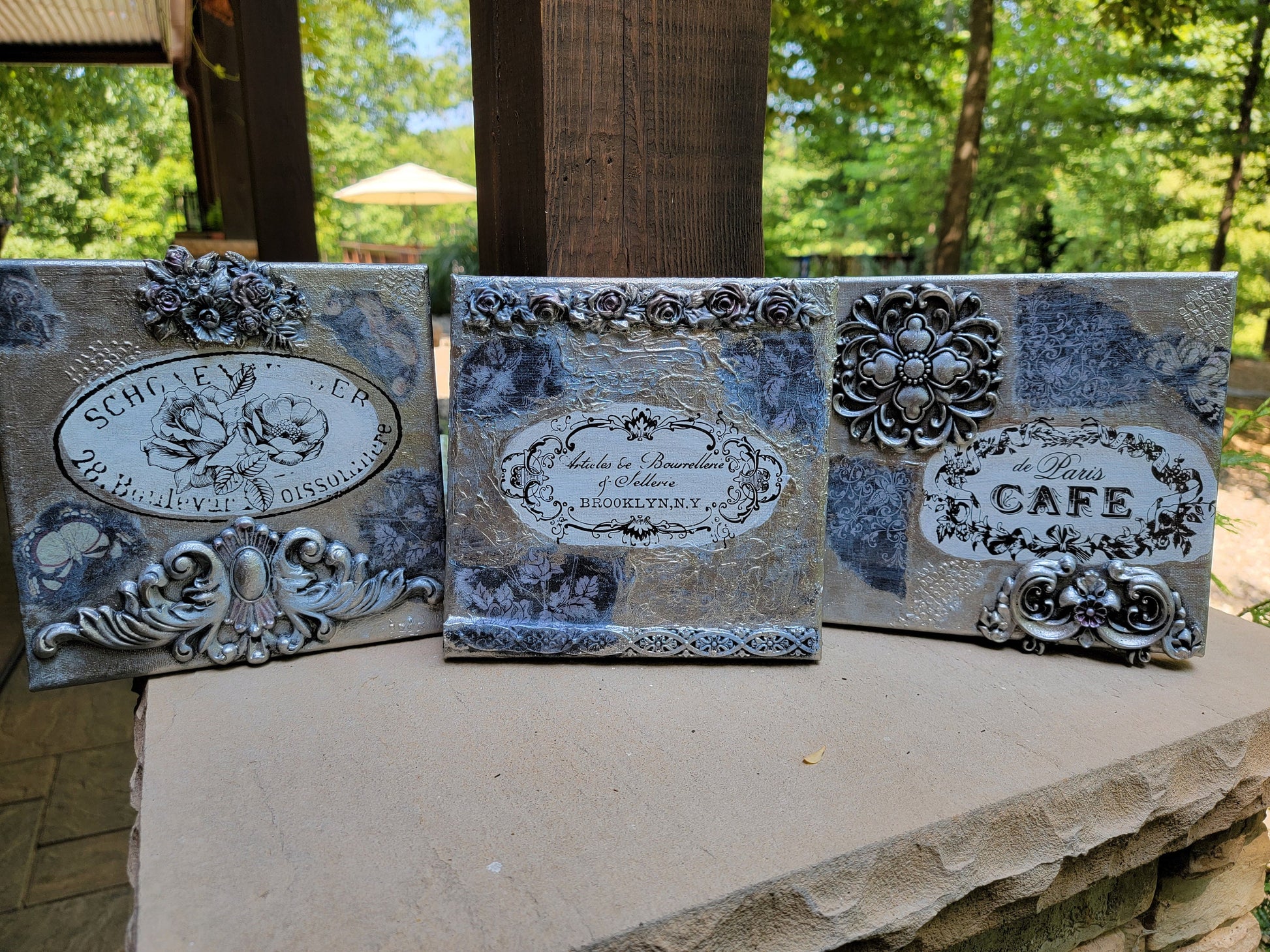 This listing is for items as pictured. You may select one or the whole set of 3. Use the dropdown menu to make your selection. 8" x 8" unframed canvases handpainted using Paint Couture paint (available in this shop) in Linnea, with floral and baroque scroll moldings, floral and butterfly decoupage, décor rub-on transfers with a French theme, texture and Paint Couture metallic paint in Stardust creating a French flamboyant look perfect for adding some moody shine to your décor!