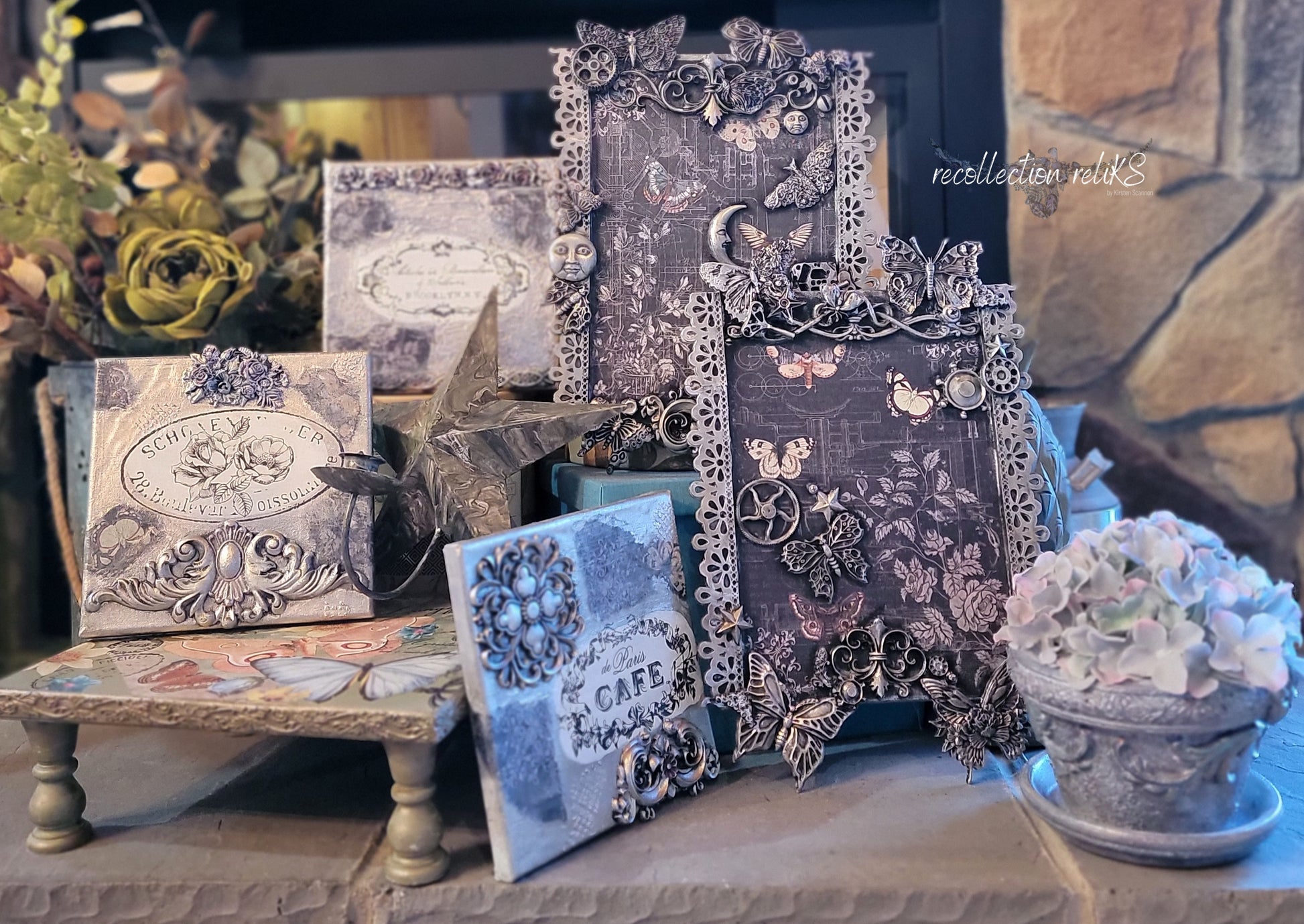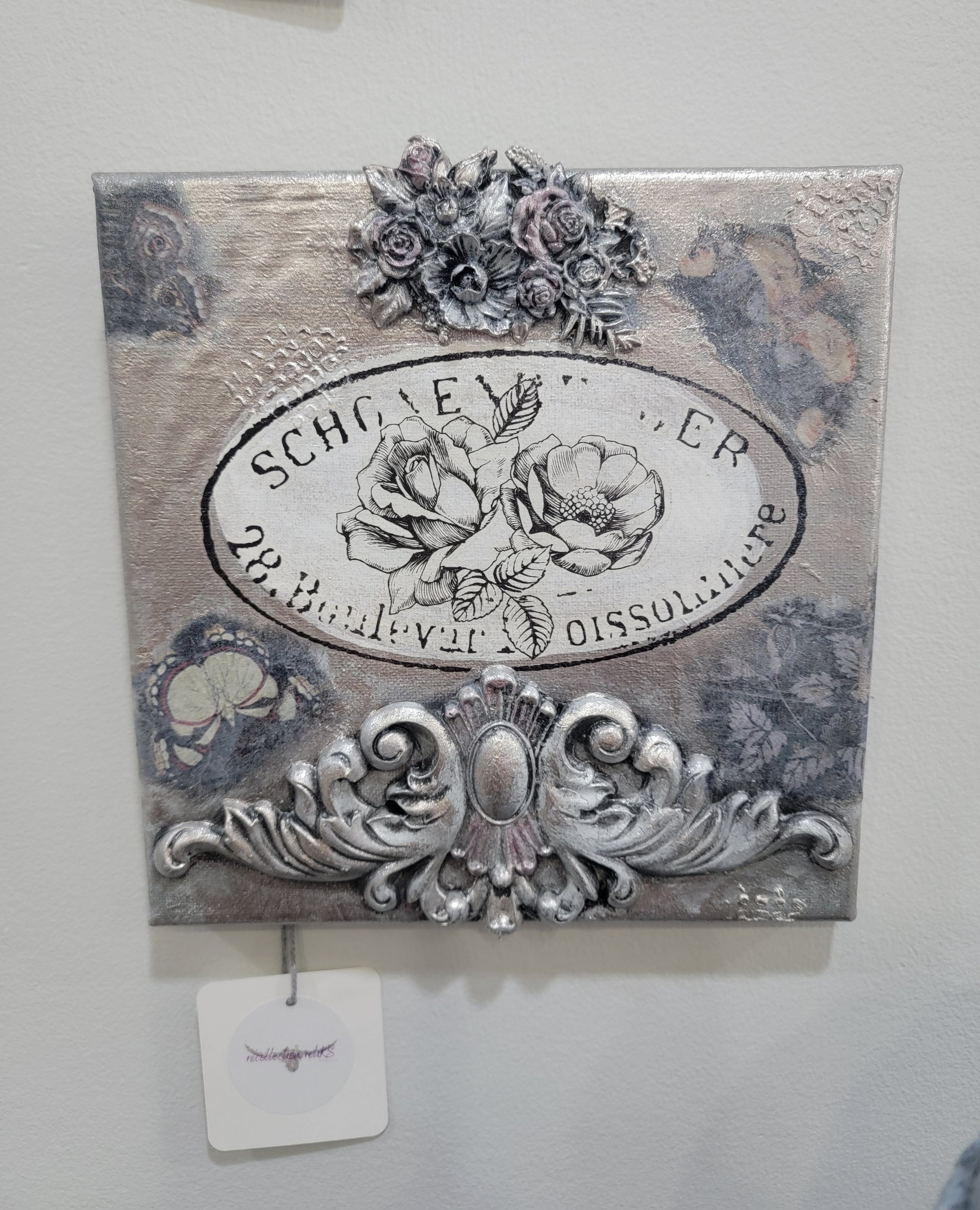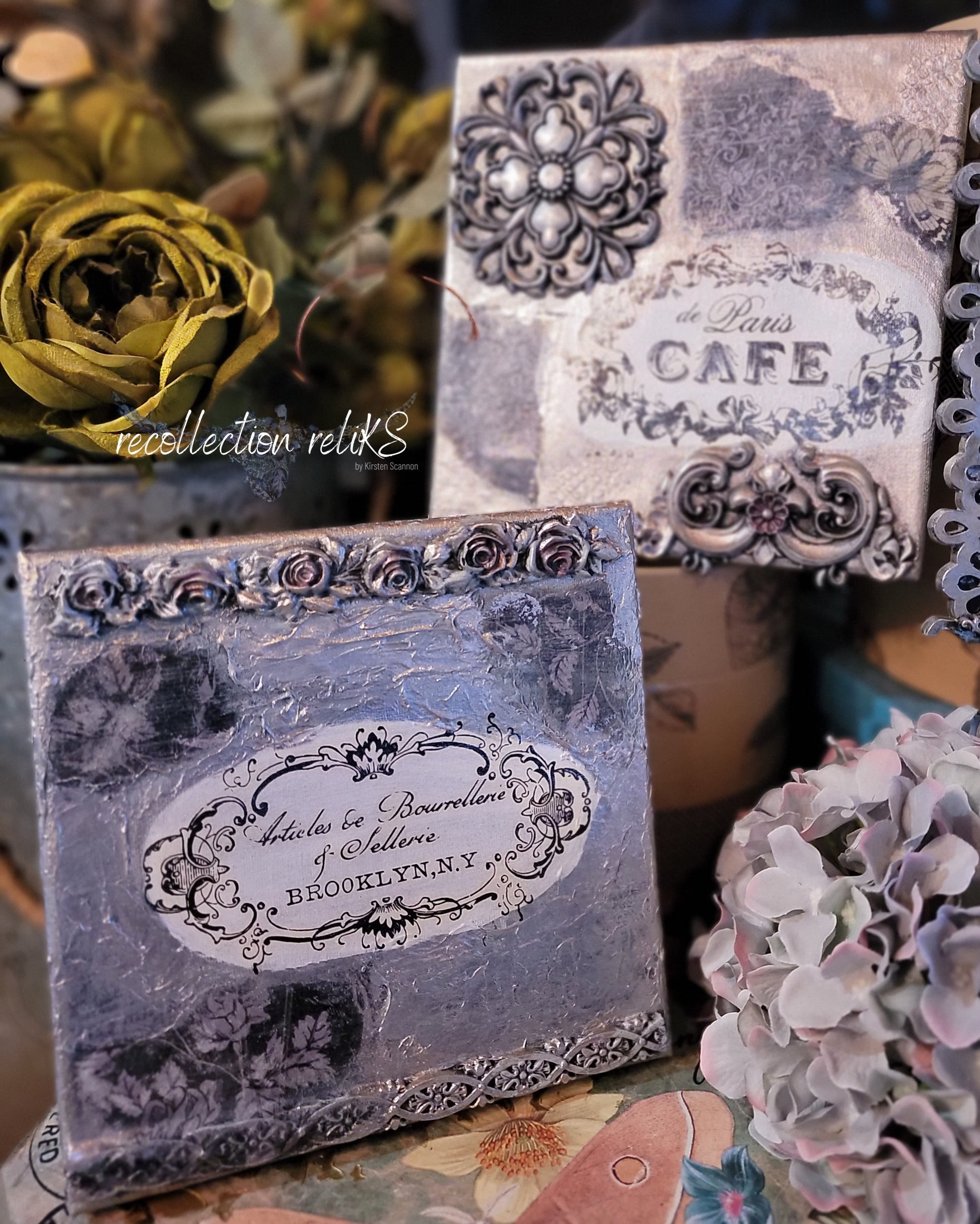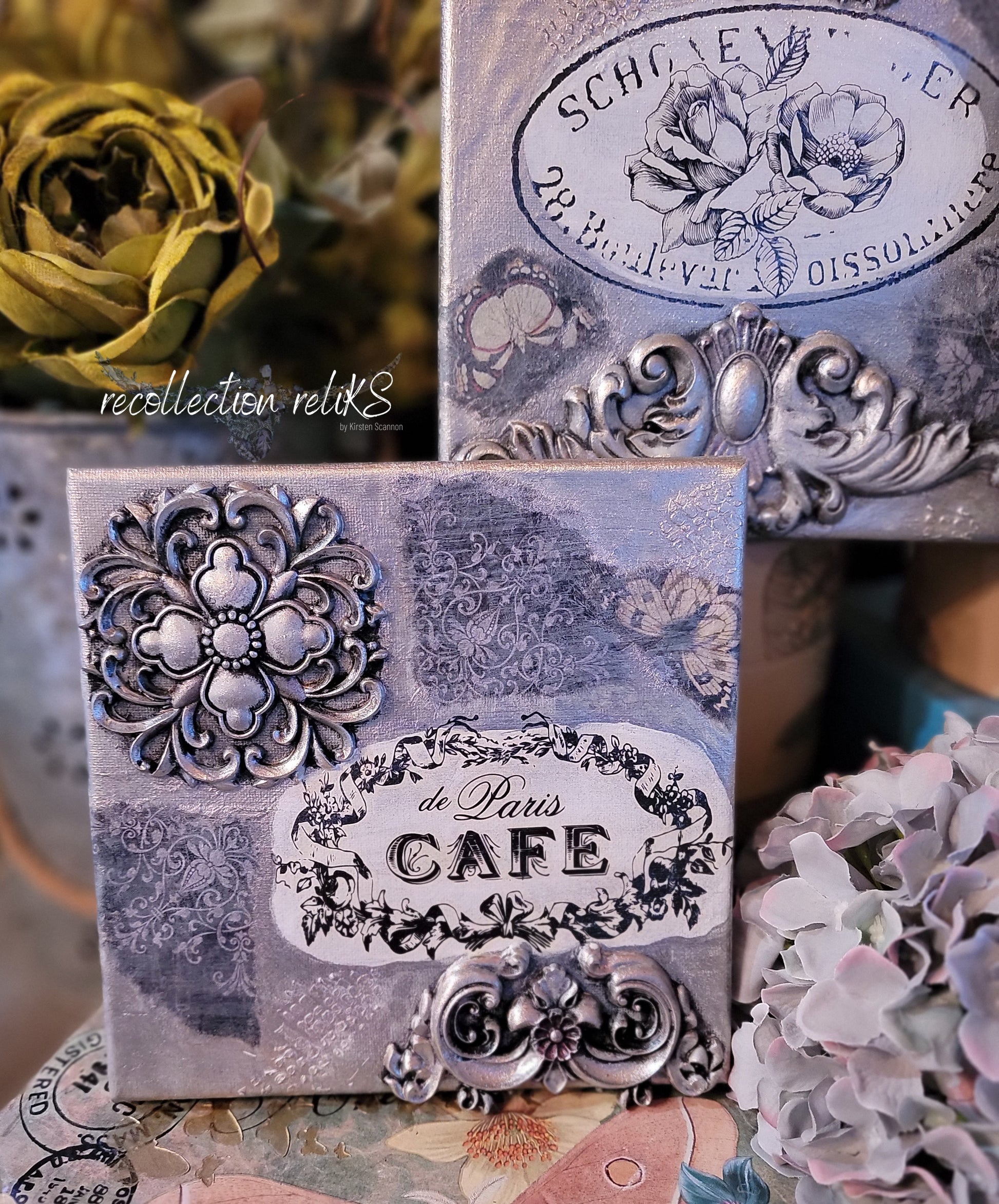This listing is for items as pictured. You may select one or the whole set of 3. Use the dropdown menu to make your selection. 8" x 8" unframed canvases handpainted using Paint Couture paint (available in this shop) in Linnea, with floral and baroque scroll moldings, floral and butterfly decoupage, décor rub-on transfers with a French theme, texture and Paint Couture metallic paint in Stardust creating a French flamboyant look perfect for adding some moody shine to your décor!