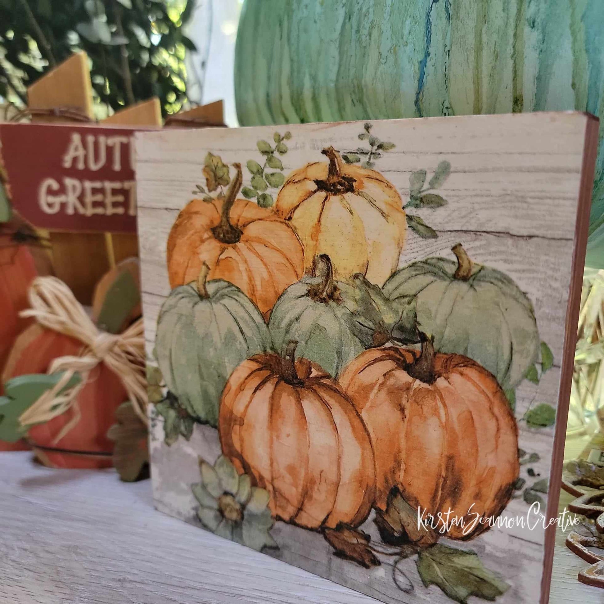 This square wood panel was decoupaged using a watercolor pumpkin scene napkin with gorgeous subdued autumn colors. The sides were stained in a complementary walnut shade.