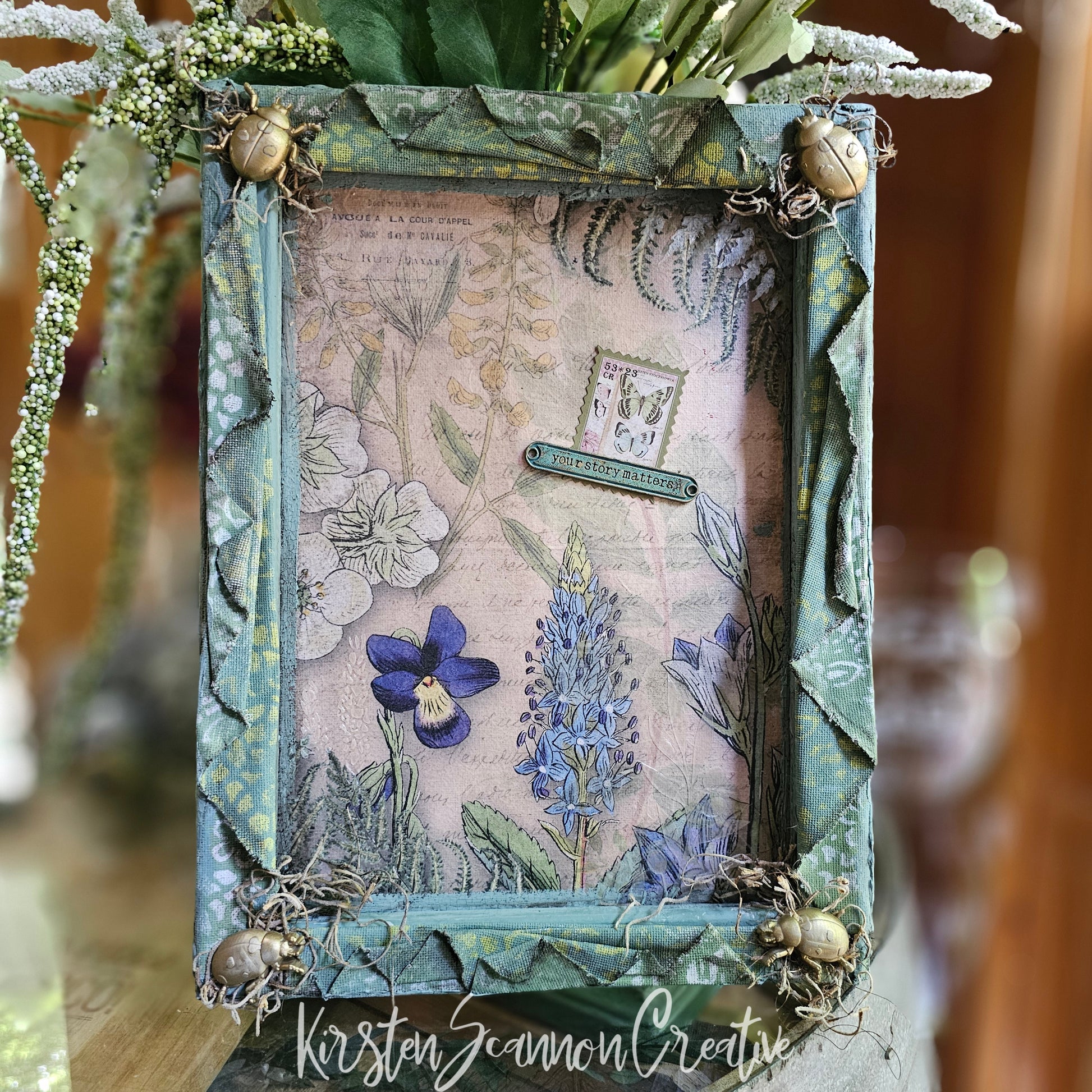 Elevate your home decor with the Your Story Matters Mixed Media Canvas. This chic piece features decoupage, stenciling, and a nature-inspired color palette of blues, greens, and moss. Adorned with resin cast ladybugs and a metal finding, it's the perfect blend of art and nature. Tell your unique story with this beautiful canvas.