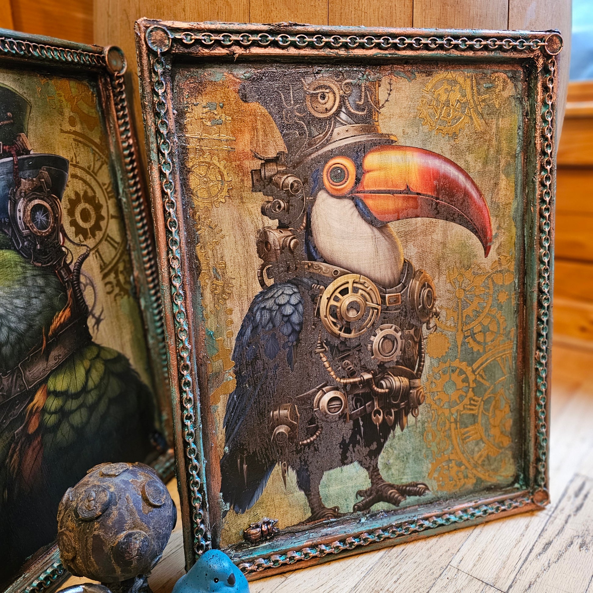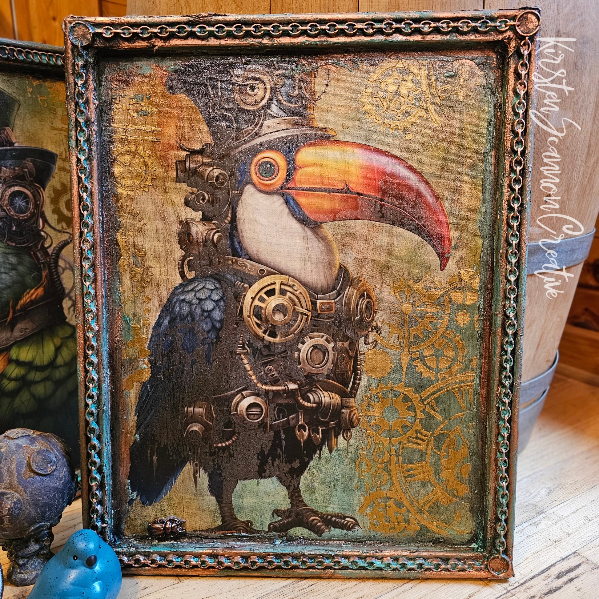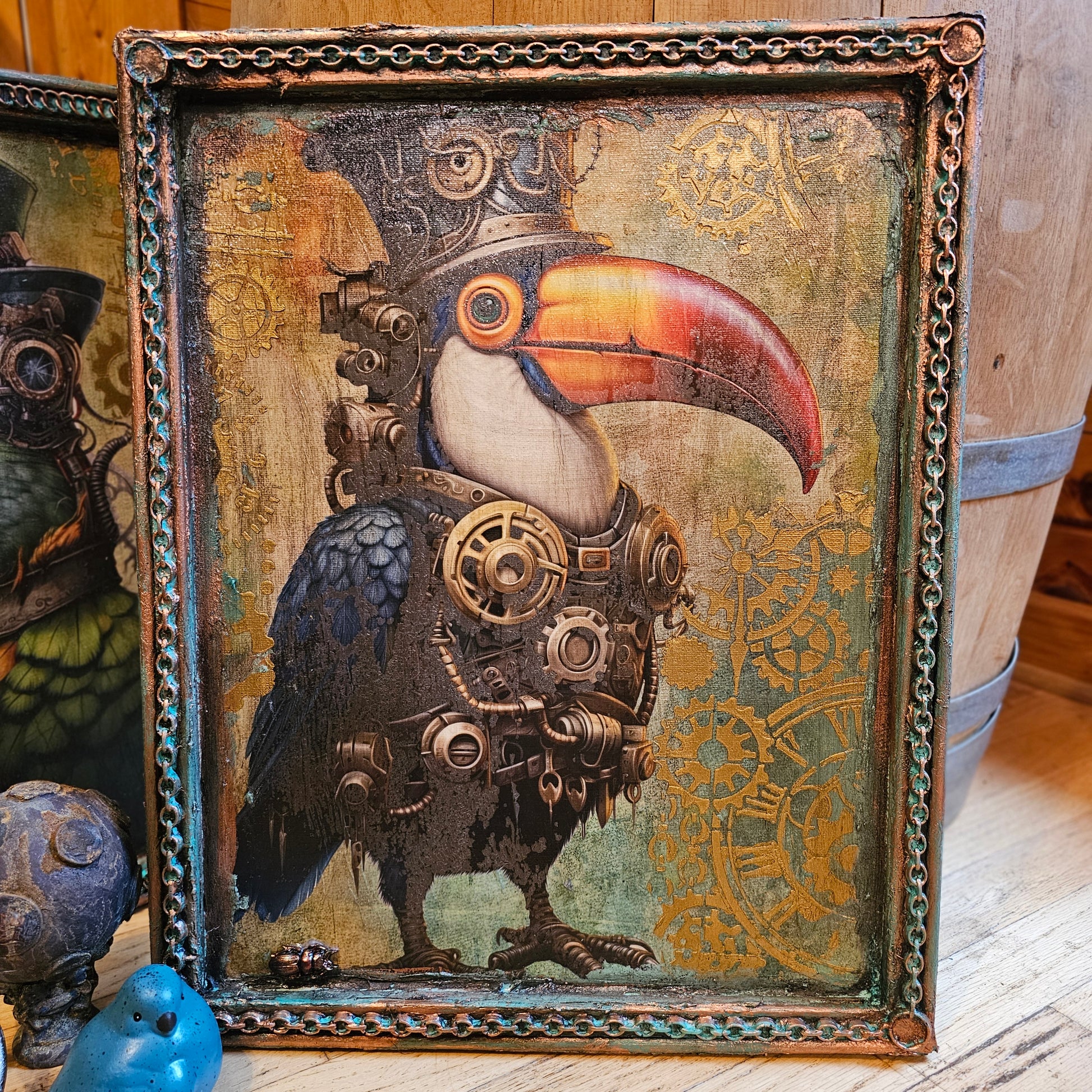 Embark on a daring decorating journey with our Too Live Crew Beakie Mixed Media Wall Hanging! This unique piece features a decoupaged steampunk toucan on canvas with added texture and a bold color palette. The frame is elevated with resin cast appliques for an adventurous touch. Take your home decor to the next level!